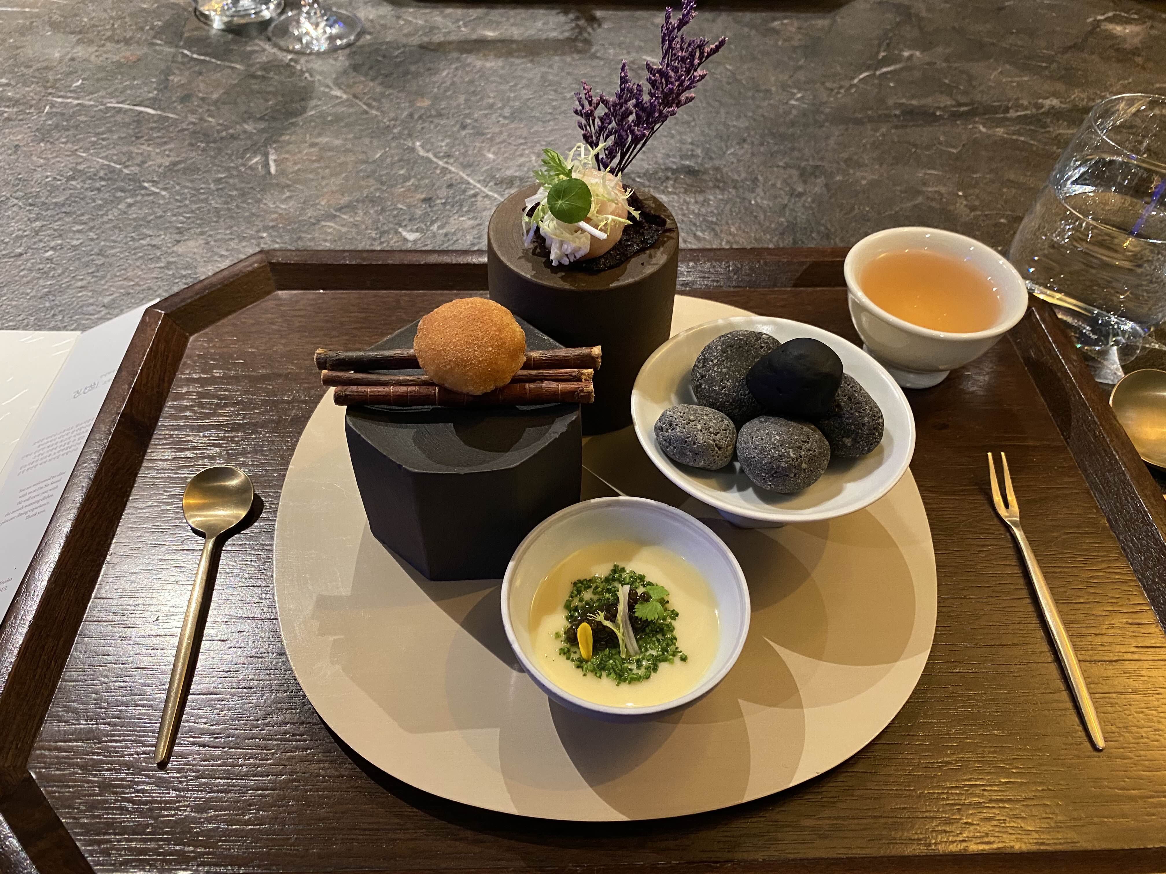 단새우요리, 명란 감자 퓌레 감자볼, 계란찜, 오징어 먹물빵