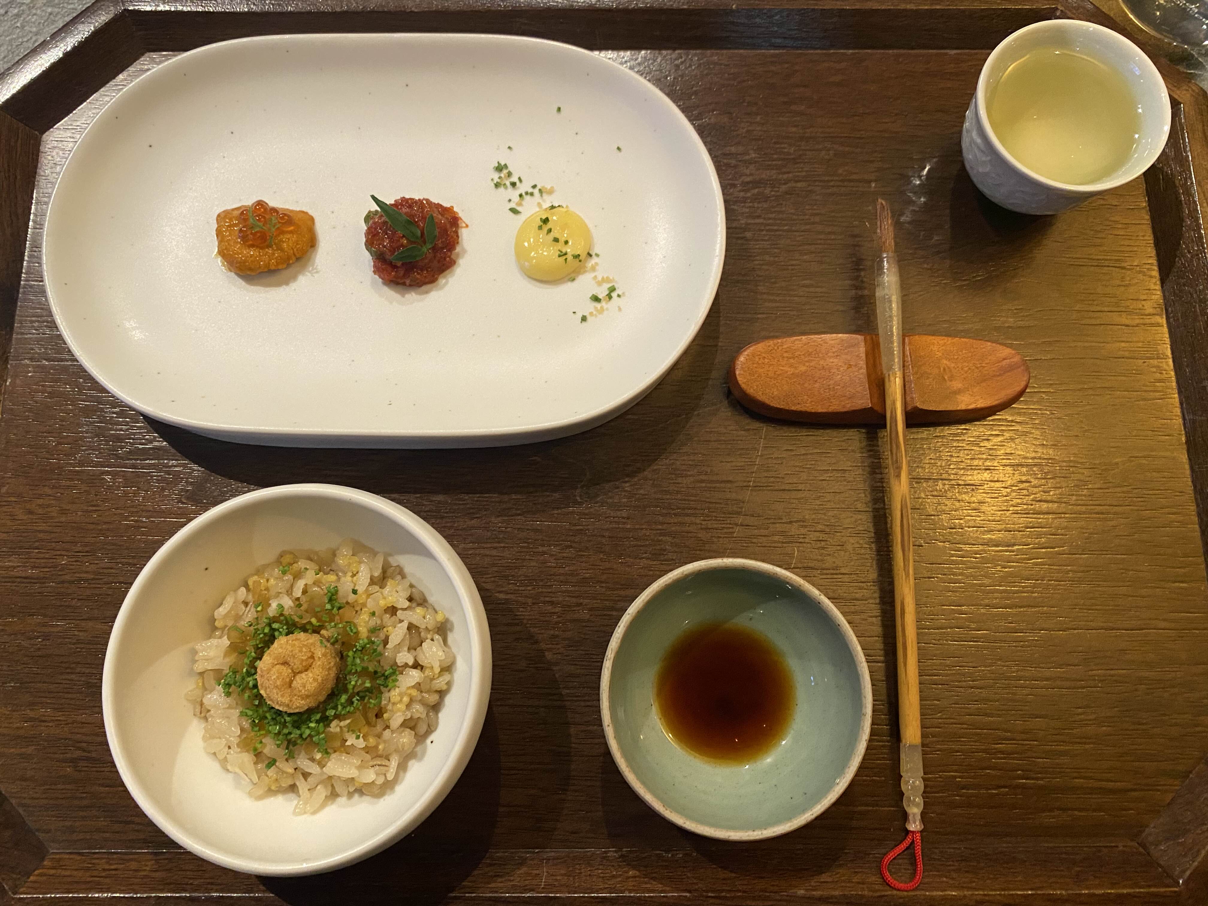 귀한 우니와 연어알,오징어 젓갈, 갈릭 아이올리 소스 중 취향대로 김에 같이 싸서 먹으면 됩니다.